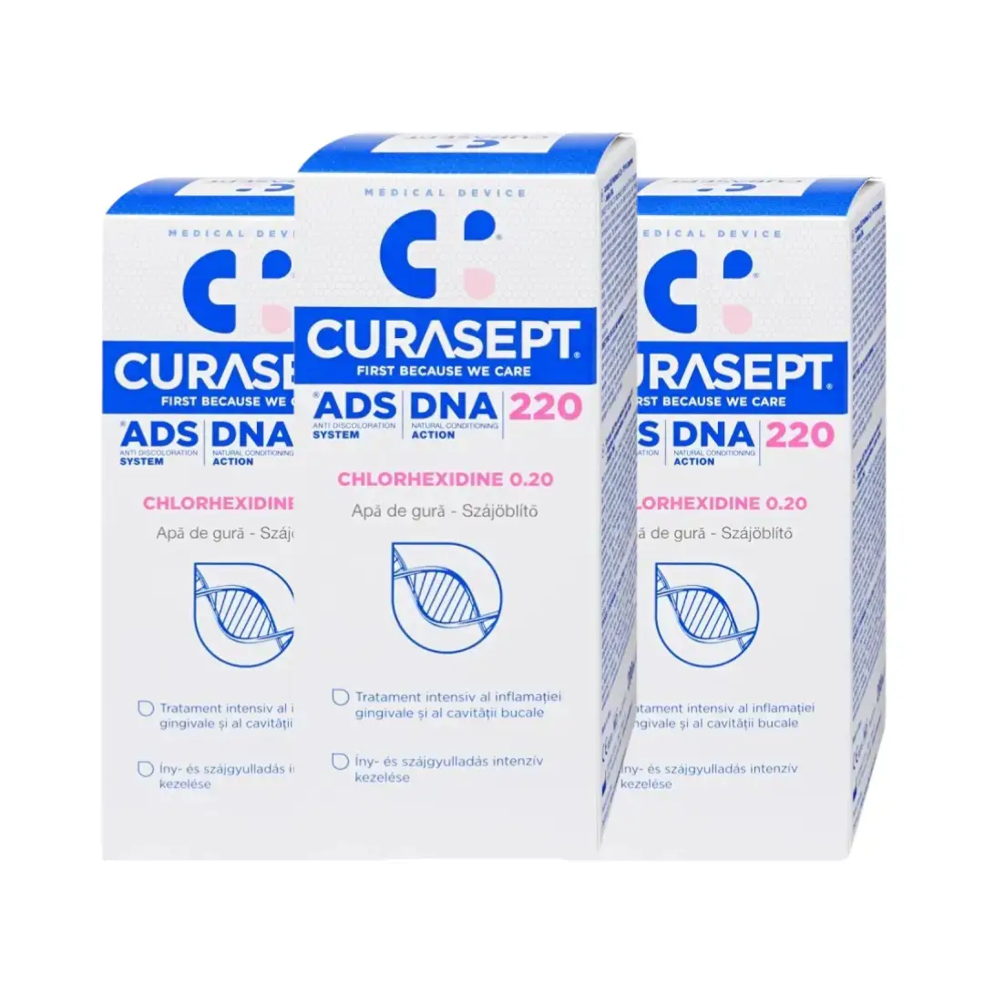 CURASEPT ADS-DNA 220 to specjalistyczny płyn do płukania jamy ustnej z chlorheksydyną 0,20%, przeznaczony do intensywnej ochrony antybakteryjnej oraz wsparcia regeneracji dziąseł i błony śluzowej.