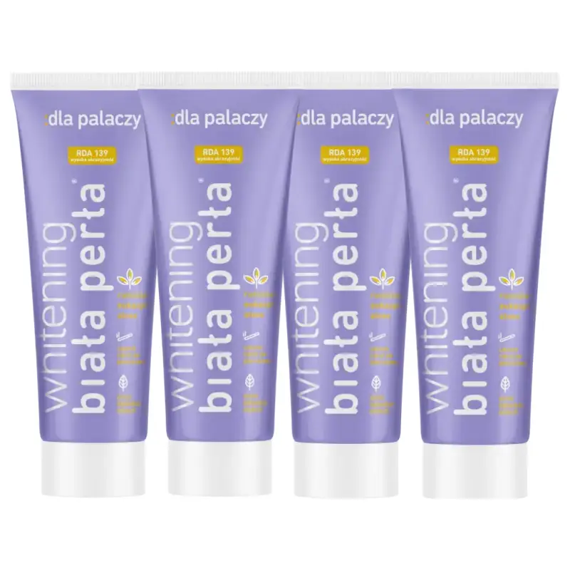 4x BIAŁA PERŁA DLA PALACZY to zestaw czterech past do zębów przeznaczonych do codziennej higieny jamy ustnej osób palących. Produkt pomaga usuwać przebarwienia po nikotynie i odświeżać oddech i jest polecany szczególnie dla osób, które zmagają się z osadem, żółknięciem zębów oraz tzw. „oddechem palacza”.
