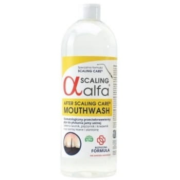 ALFA Scaling Care to płyn do płukania jamy ustnej o działaniu profilaktyczno-pozabiegowym, przeznaczony szczególnie do stosowania po zabiegach skalingu i kiretażu. Produkt pomaga redukować krwawienie dziąseł, wspiera proces gojenia oraz łagodzi ból, zapewniając większy komfort po zabiegach stomatologicznych.