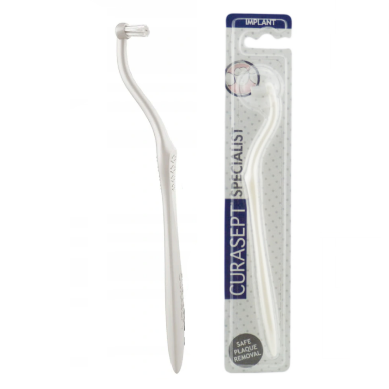 CURASEPT SPECIALIST IMPLANT to jednopęczkowa szczoteczka do precyzyjnej higieny implantów zębowych. Dzięki ergonomicznemu uchwytowi i elastycznemu, miękkiemu włosiu szczoteczka skutecznie usuwa płytkę nazębną i resztki pokarmowe, nie uszkadzając powierzchni protetycznych i implantów.