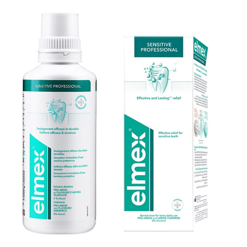 Elmex Sensitive Professional to płyn do płukania jamy ustnej przeznaczony dla osób z nadwrażliwością zębów. Produkt pomaga redukować ból związany z nadwrażliwością, chronić zęby oraz wspierać codzienną higienę jamy ustnej i jest polecany szczególnie dla osób, które odczuwają dyskomfort podczas spożywania zimnych, gorących lub słodkich produktów.