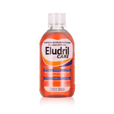 ELUDRIL Care to płyn do płukania jamy ustnej przeznaczony do codziennego stosowania. Skutecznie wspiera higienę jamy ustnej, redukując płytkę nazębną i pomagając zapobiegać powstawaniu kamienia.