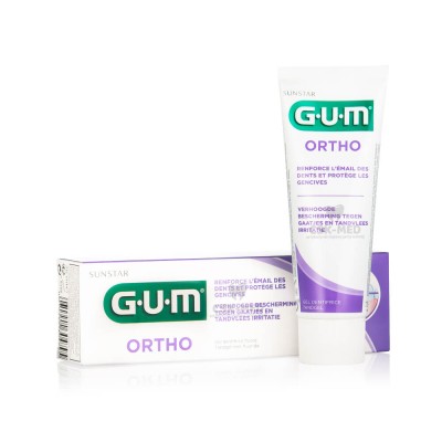 Ortodontyczna pasta do zębów GUM Ortho, jak sama nazwa wskazuje, przeznaczona jest szczególnie dla osób z aparatami ortodontycznymi. Ta ortodontyczna pasta do zębów ma za zadanie chronić zdrowie zębów przed próchnicą i podrażnieniami jamy ustnej. Pasta ortodontyczna GUM Ortho, dzięki zawartości skutecznych składników aktywnych w swoim składzie, doskonale wzmacnia szkliwo zębów oraz przeciwdziała powstawaniu białych przebarwień.