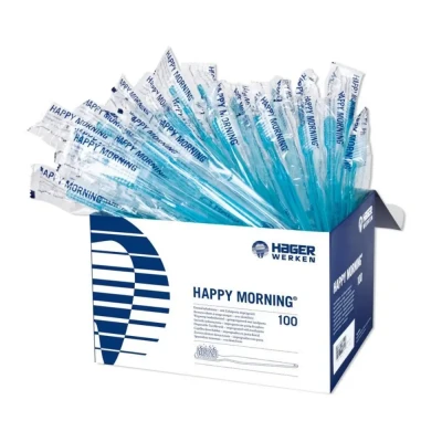 Szczoteczka do zębów Happy Morning nasączona jest pastą o smaku świeżej mięty. Charakteryzuje się miękkim i delikatnym włosiem. Zapewniają dokładne czyszczenie zębów, dbając przy tym o dziąsła.