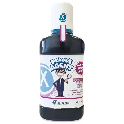 Płyn Miradent Plaque Agent pozwala w prosty sposób sprawdzić technikę szczotkowania zębów i jednocześnie motywuje do codziennej higieny jamy ustnej - szczególnie polecany u dzieci oraz podczas leczenia ortodontycznego. Płyn stosujemy po umyciu zębów w celu sprawdzenia czy zostały one dokładnie wyczyszczone. Po zastosowaniu płynu osad nazębny zostaje wybarwiony na na niebieski kolor.