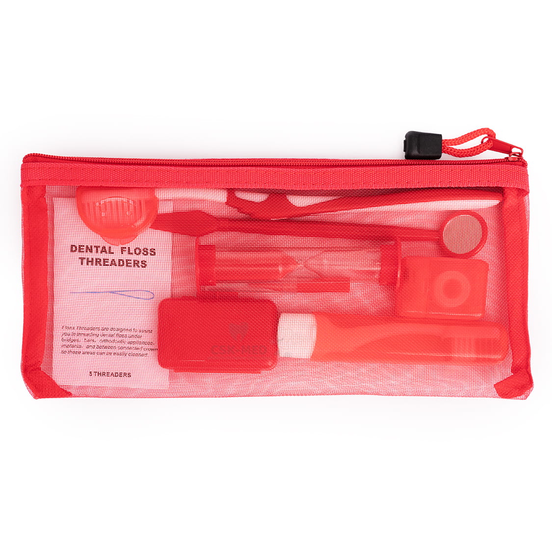 - opakowanie: szczoteczka do zębów 1szt., szczoteczka podróżna, składana 1szt., lusterko stomatologiczne 1szt., klepsydra do odmierzania czasu mycia zębów (2 min) 1szt., wosk ortodontyczny 1szt., nić ortodontyczna (5 odcinków), szczoteczka międzyzębowa 1 szt.