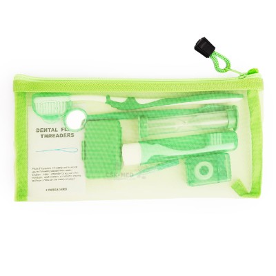- opakowanie: szczoteczka do zębów 1szt., szczoteczka podróżna, składana 1szt., lusterko stomatologiczne 1szt., klepsydra do odmierzania czasu mycia zębów (2 min) 1szt., wosk ortodontyczny 1szt., nić ortodontyczna (5 odcinków), szczoteczka międzyzębowa 1 szt.