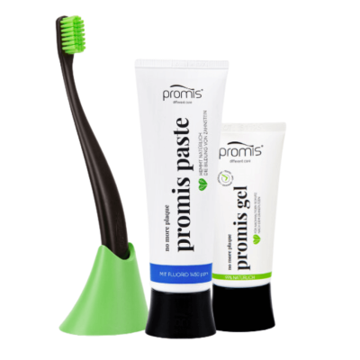 Zestaw PROMIS działa wieloetapowo, zapewniając kompleksową ochronę jamy ustnej. Pasta do zębów z fluorem pomaga usuwać płytkę nazębną oraz chronić szkliwo przed próchnicą. Żel przeciwko płytce nazębnej wspiera ograniczanie przylegania bakterii do powierzchni zębów, co pomaga zmniejszyć ryzyko powstawania kamienia nazębnego. Szczoteczka umożliwia dokładne mechaniczne oczyszczanie zębów, a stojak zapewnia wygodne i higieniczne przechowywanie. Regularne stosowanie całego zestawu pozwala poprawić kondycję jamy ustnej oraz utrzymać świeży oddech.
