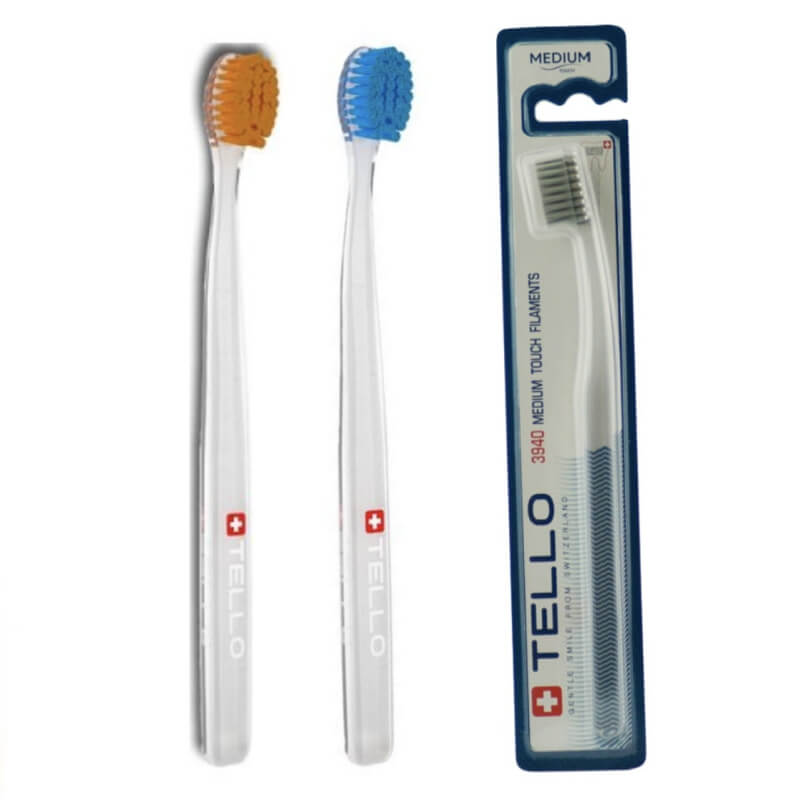 TELLO MEDIUM 3940 to średniej miękkości szczoteczka do zębów szwajcarskiej produkcji, zaprojektowana z myślą o skutecznym i bezpiecznym czyszczeniu zębów oraz dziąseł. Szczoteczka posiada aż 3940 cienkich włókien, które dokładnie oczyszczają zęby, zapewniając komfort podczas szczotkowania.